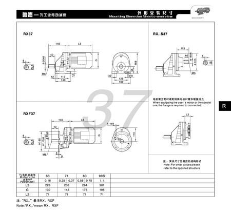 R系列斜齒輪硬齒面減速機:R為兩級或三級減速 RX為單級 規格型號: R17、R27、R37、R47、R57、R67、R77、R87、R97、R107、R137、R147、R167 RX37、RX57、RX67、RX77、RX87、RX97、RX107、RX127、RX157 R37輸入功率為0.18KW~3kw;傳動比為3.33~134.82;減速機重量為8.5kg。