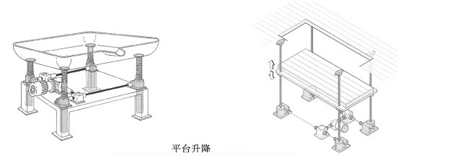 同時聯動推動平臺的上升或下降,原理相同,都是電機連接轉向箱,然后通過換向器和連接桿使多臺升降機同時做運動。