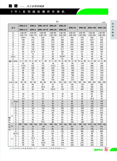 SWL系列蝸輪螺桿升降機,蝸輪絲桿升降機有不同的結構型式和裝配方式,提升高度可按要求加工制造。請根據實際使用負荷、螺桿行程和起升速度選擇合適的絲桿升降機。