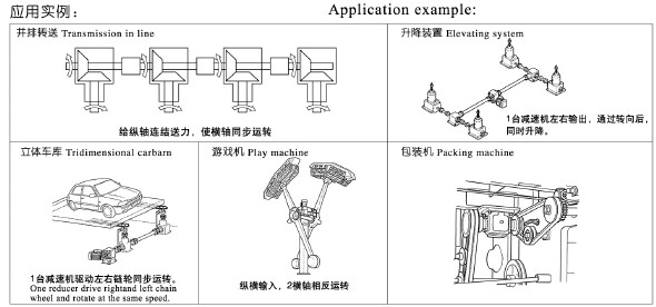 轉向器可做并排傳送;立體車庫(一臺減速機驅動左右鏈輪同步運轉),升降平臺,包裝機,游戲機應用等。T型轉向箱具有多種安裝形式,選用方便。